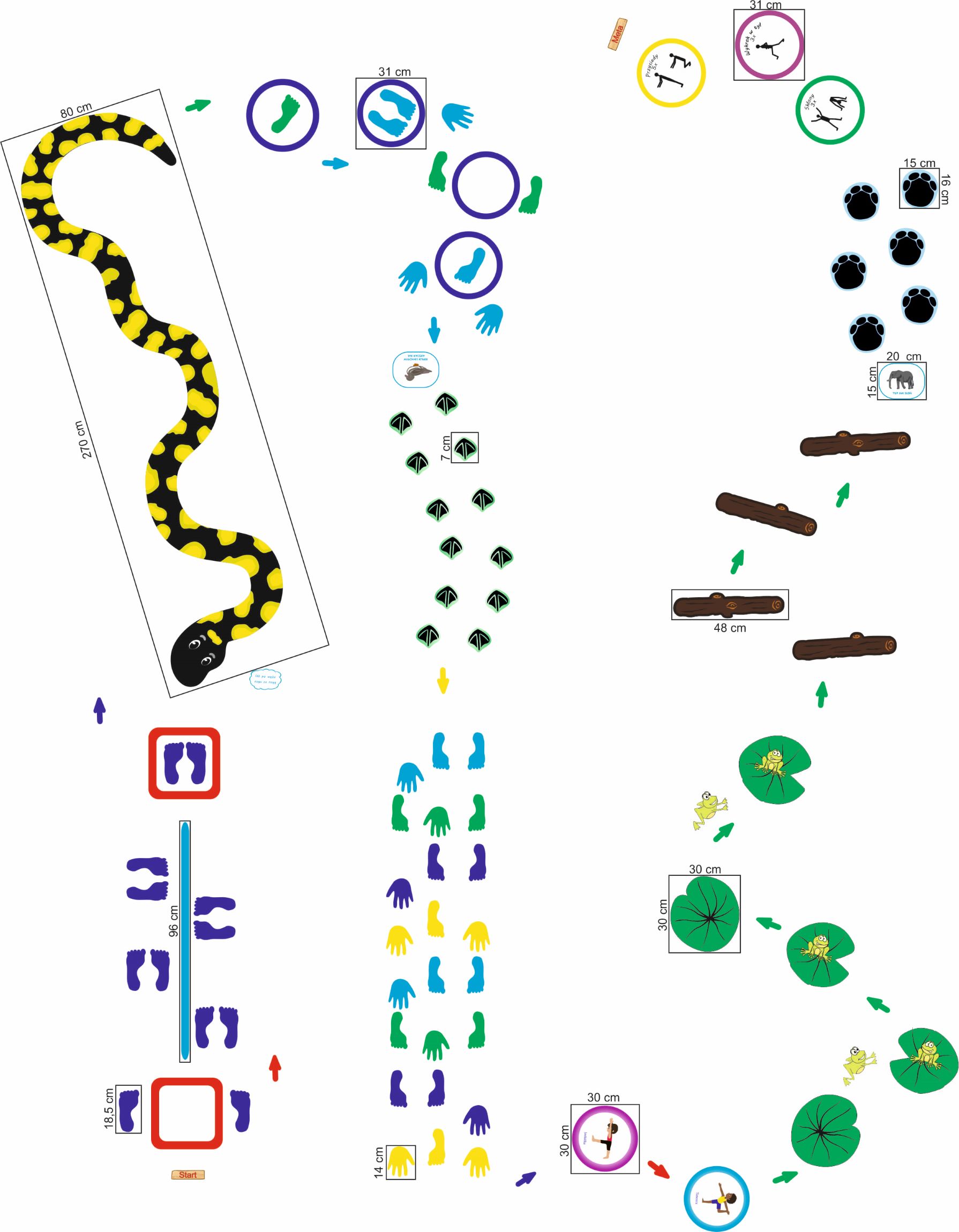 Start. Skacz po kolorowych stopach zgodnie ze sposobem ich naklejenia. Po wężu idź powoli stopa za stopą aż dojdziesz do mety. Uważaj by nie spaść z węża. Idź po śladach zwierząt, rozpoznaj ich tropy. Na stacjach z zadaniami wykonaj narysowane ćwiczenie. Po listkach nenufarów skacze dotykając listka jednocześnie stopami i rękoma, uważając aby nie wyjść poza obrys liścia. Po belkach możemy skakać obunóż lub na jednej nodze albo też iść stopa za stopą.