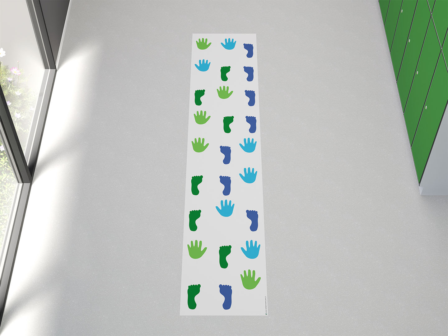 Mata na podłogę dla dzieci wielokrotnego użytku pokryta laminatem o wymiarach 60x 255 cm. Prawa stopa w kolorze granatowym, lewa ciemno zielona. Analogicznie w przypadku dłoni zastosowano te same barwy tylko o jaśniejszym odcieniu.