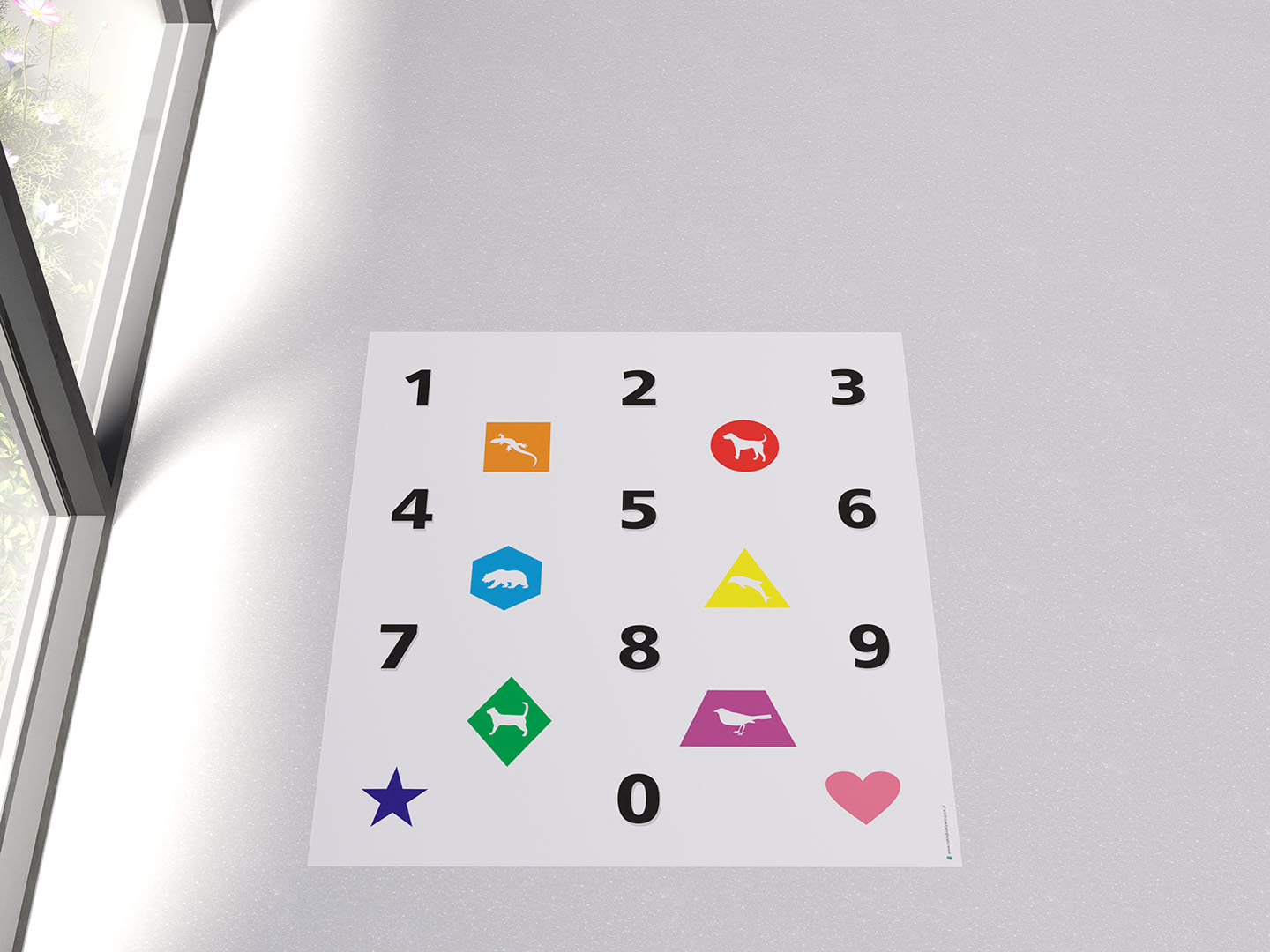 Możemy stopniować tempo zabawy a tym samym utrudniać zadanie. Np. prawa noga na „3” lewa ręka na „kwadrat”, lewa noga na „czerwony”, prawa ręka na „psa”…itd. Mata zawiera cyfry, figury geometryczne, zwierzęta, i symbole. Jeden symbol może mieć aż 3 znaczenia. Jest to okazja by połączyć różne zmysły do zintegrowanej pracy. Matę można wykorzystać do rozwijającej zabawy, albo jako pomoc w terapii.