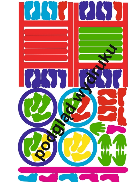 Ścieżka geometryczna 4 – można zaaranżować na różne sposoby. Dla młodszych dzieci elementy mogą być naklejane bliżej siebie, dla starszych w większym oddaleniu. W zależności od przyklejenia elementów możemy uzyskać ścieżkę o długości od 7-10 metrów w linii prostej. Po ścieżce można skakać lub chodzić. Naklejki nadają się zarówno do przyklejenia na korytarz dla zachęcenia dziecka do spontanicznego ruchu jak i np. do gabinetu terapii do celowej pracy z terapeutą.