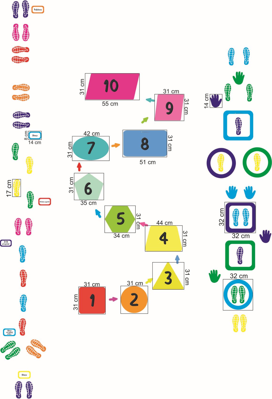 Ścieżkę można zaaranżować na różne sposoby. Dla młodszych dzieci elementy mogą być naklejane bliżej siebie, dla starszych w większym oddaleniu. Po ścieżce można skakać lub chodzić.