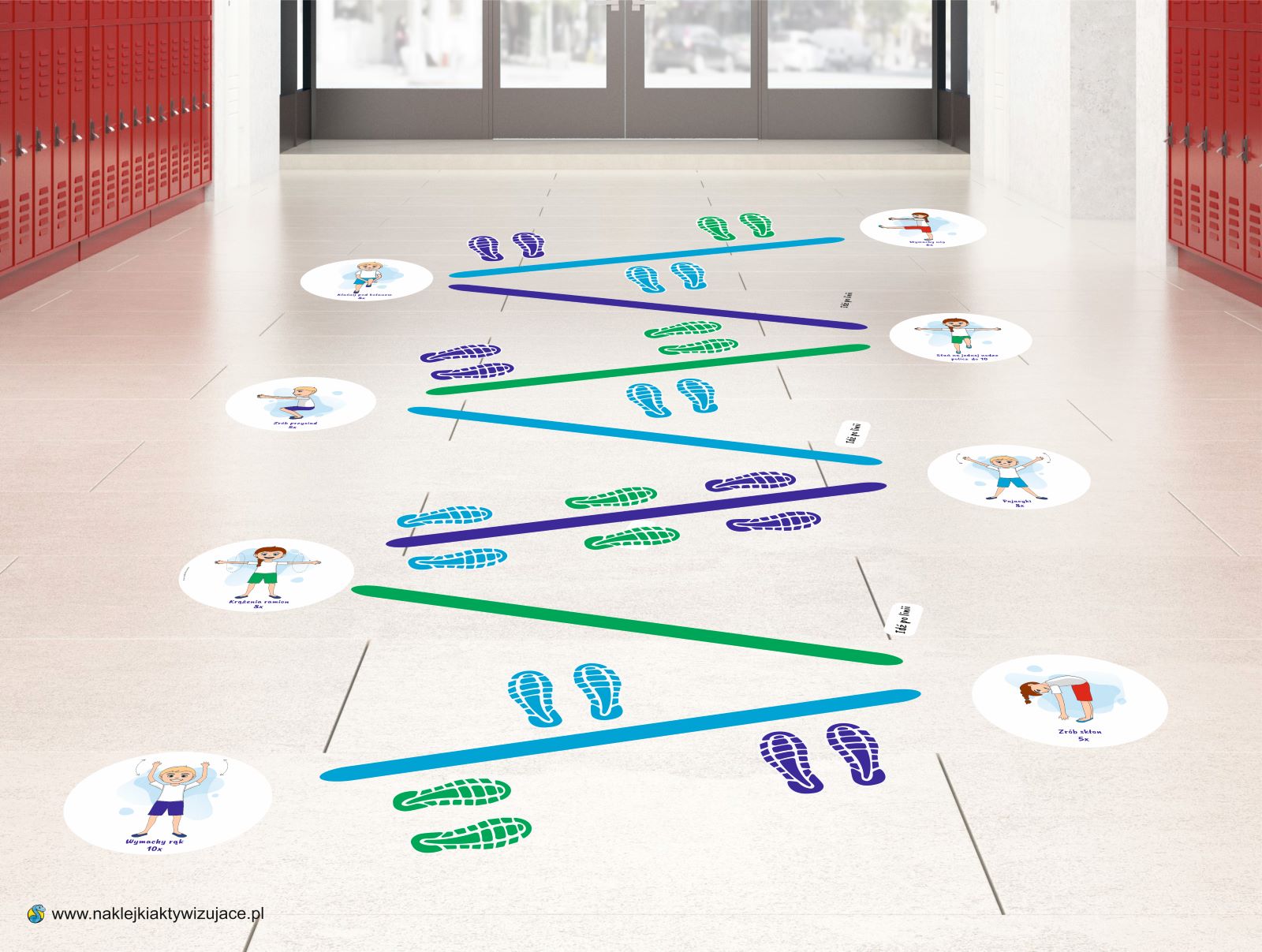 Każda naklejka to inne ćwiczenie z podaną ilością powtórzeń. Między naklejkami możemy przykleić linię, po której można chodzić lub przeskakiwać przez nią.