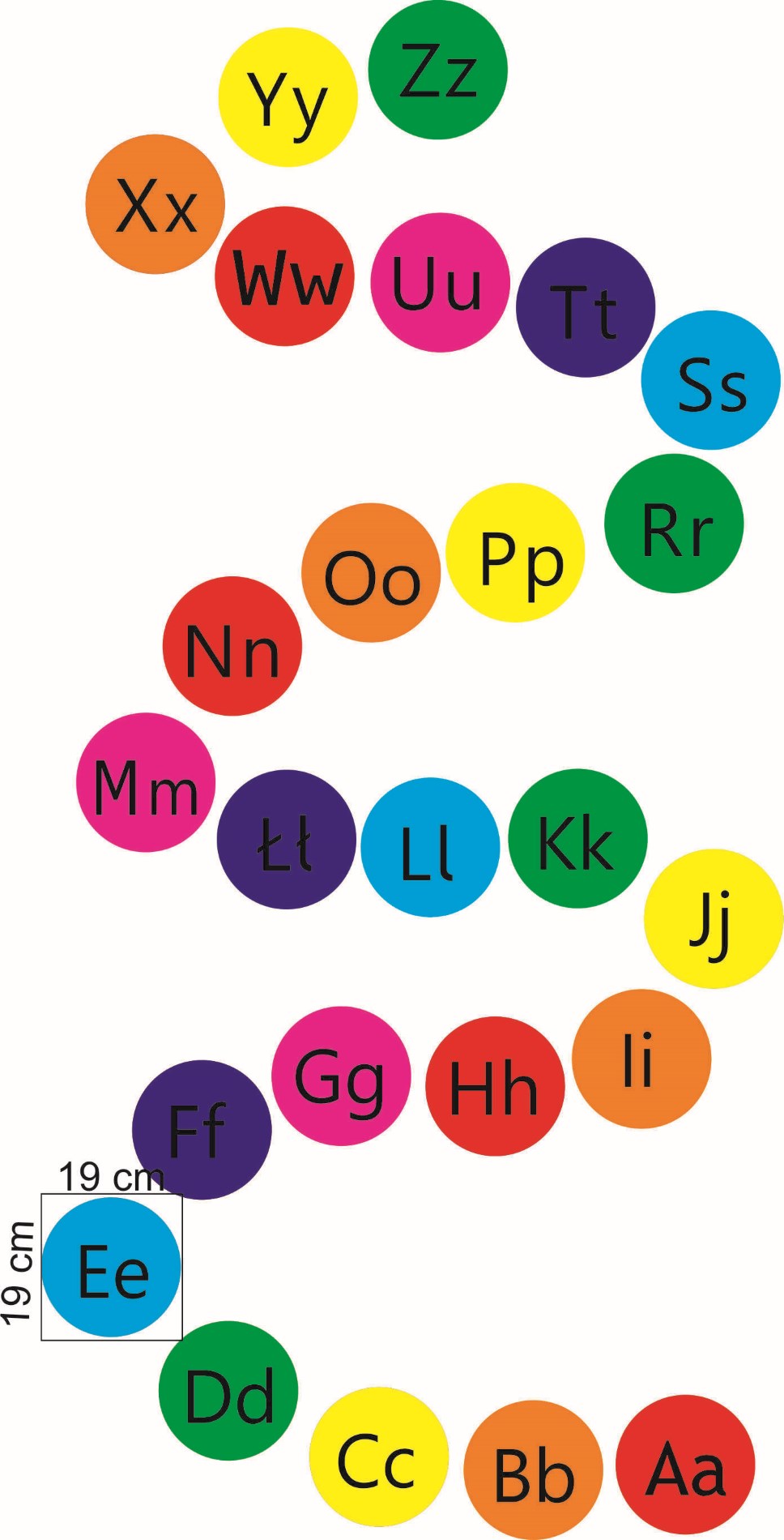 Zestaw składa się z 25 naklejek o średnicy ok. 19cm. Na każdej naklejce duże i małe litery alfabetu.