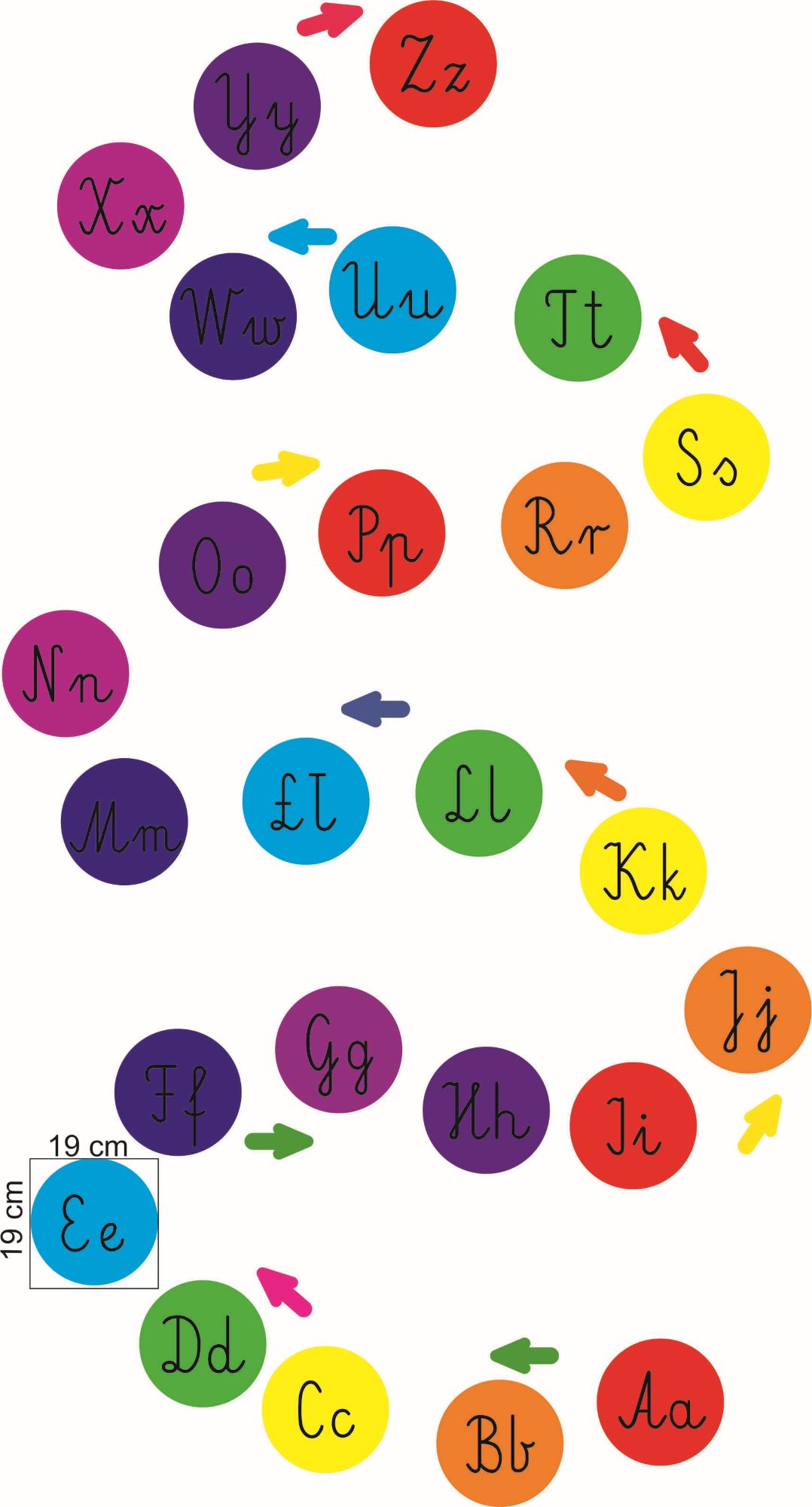 Zestaw składa się z 25 naklejek o średnicy ok. 19cm. Na każdej naklejce pisane duże i małe litery alfabetu.